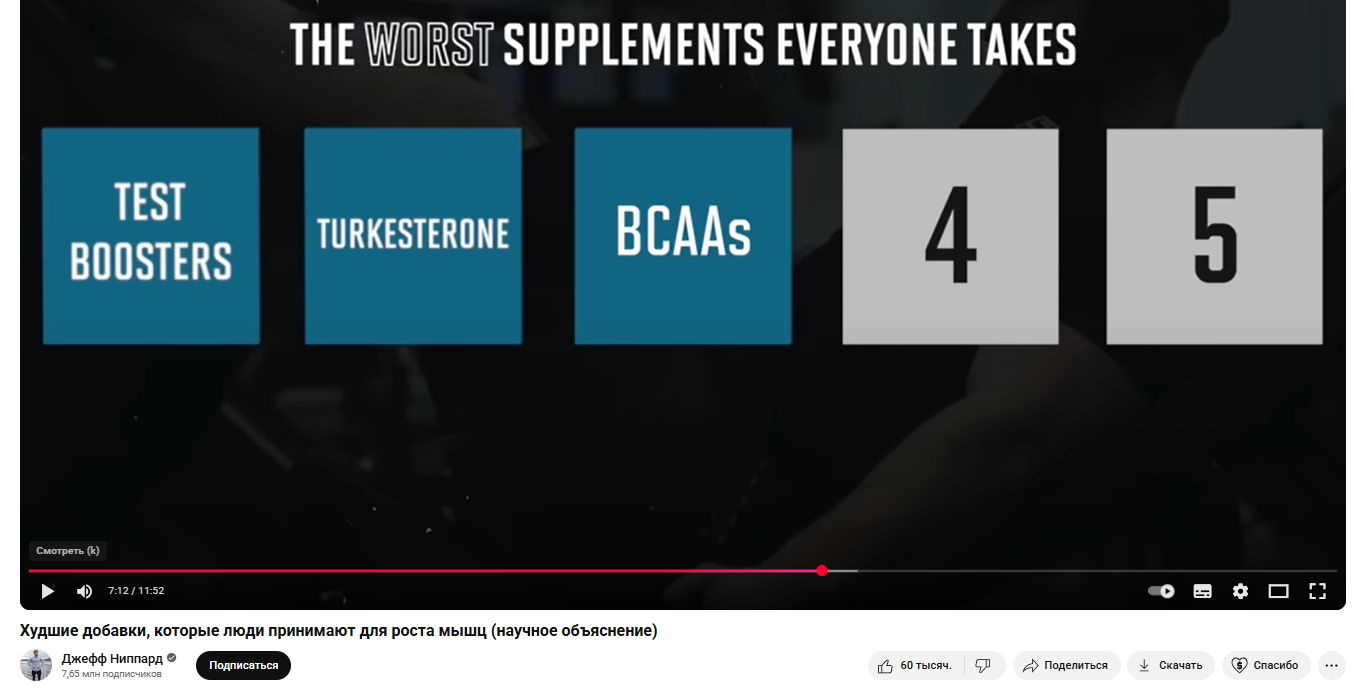 Джефф Ниппард, канадский натуральный профессиональный бодибилдер, фитнес-блогер и обладатель международной квалификации Пауэрлифтер со степенью бакалавра наук в области биохимии/химии считает ВСАА “неполноценным строительным материалом” и ставит БЦА на 3-е место среди худших добавок для роста мышц.