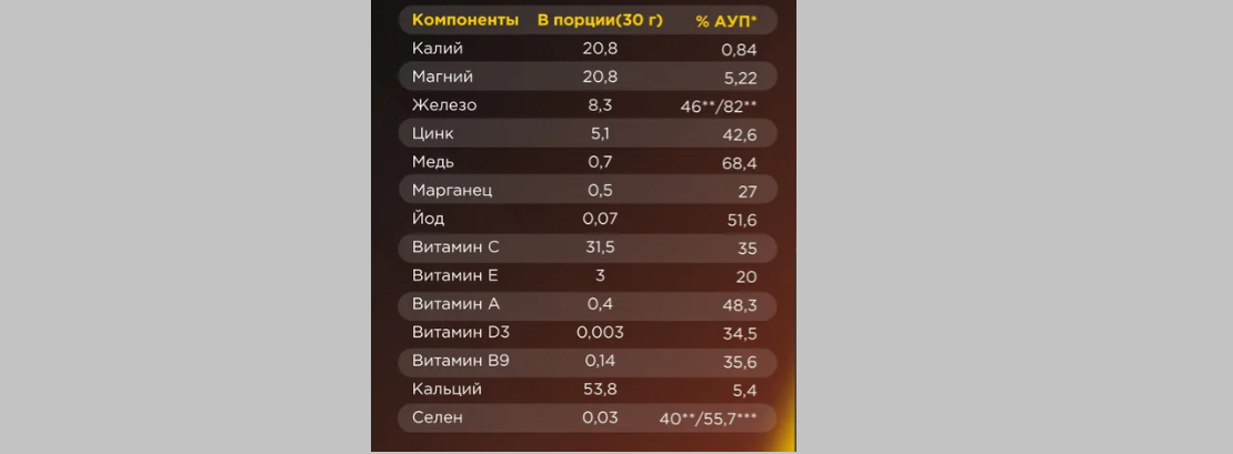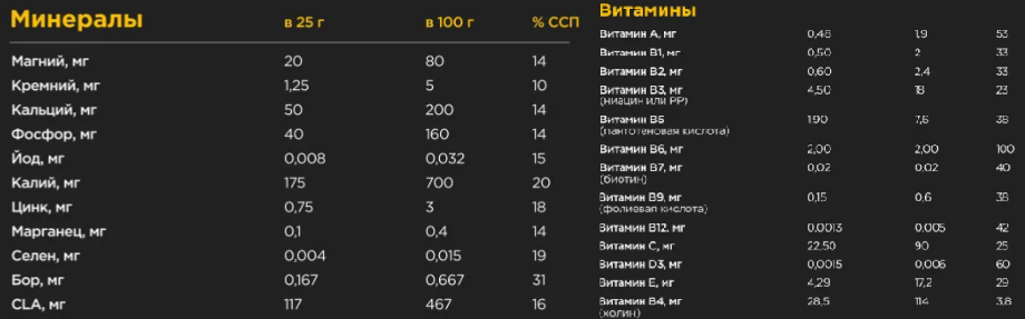 В этом продукте натрий указан только прописью в составе, в таблице на упаковке нет данных о его количестве. Поэтому посмотреть, насколько близка электролитическая пропорция к “золотому стандарту”, невозможно. Но то, что кальция, которого в поте минимальное количество, вдвое больше, чем калия и магния, говорит о том, что этот продукт скорее витаминно-минеральный комплекс, чем “восполнитель” потерь потоотделения.