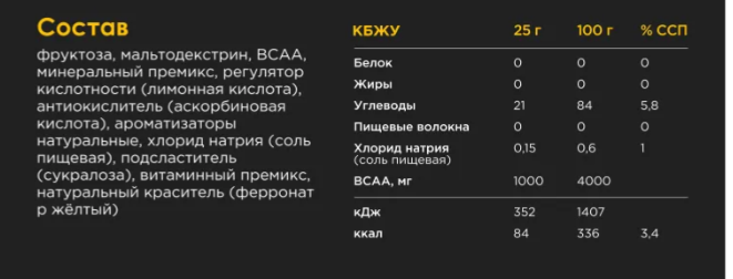 Состав: Фруктоза, мальтодекстрин, ВСАА, минеральный премикс, регулятор кислотности (лимонная кислота), антиокислитель (аскорбиновая кислота), ароматизаторы натуральные, хлорид натрия (соль пищевая), подсластитель (сукралоза), витаминный премикс, натуральный краситель (ферронат р желтый).
