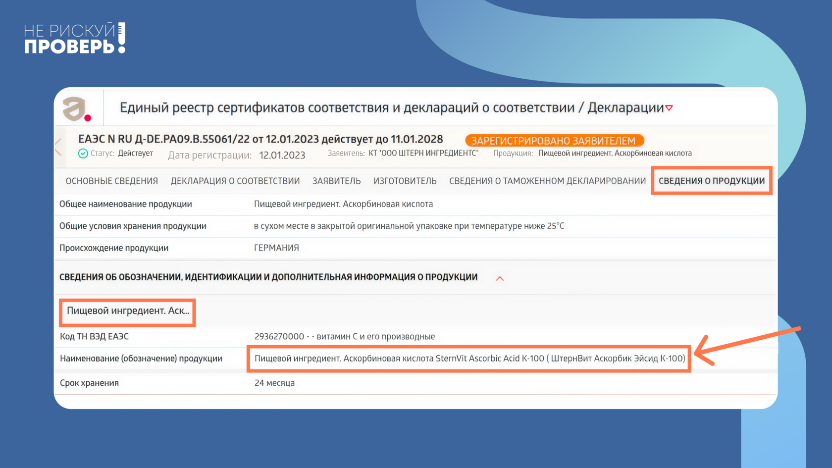 Еще один момент - декларация на бренд Mountvit, которая также была выдана на витамин С, оказалась просроченной. Ее действие закончилось в августе 2025 года, в документе стоит статус «архивный». Наличие архивной декларации под статусом «документы проверены» вызывает дополнительные вопросы.