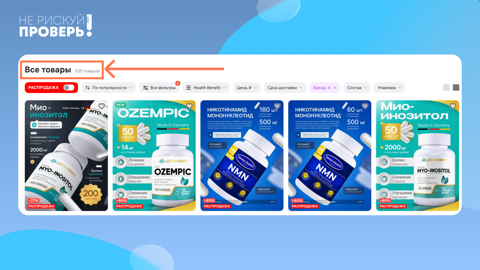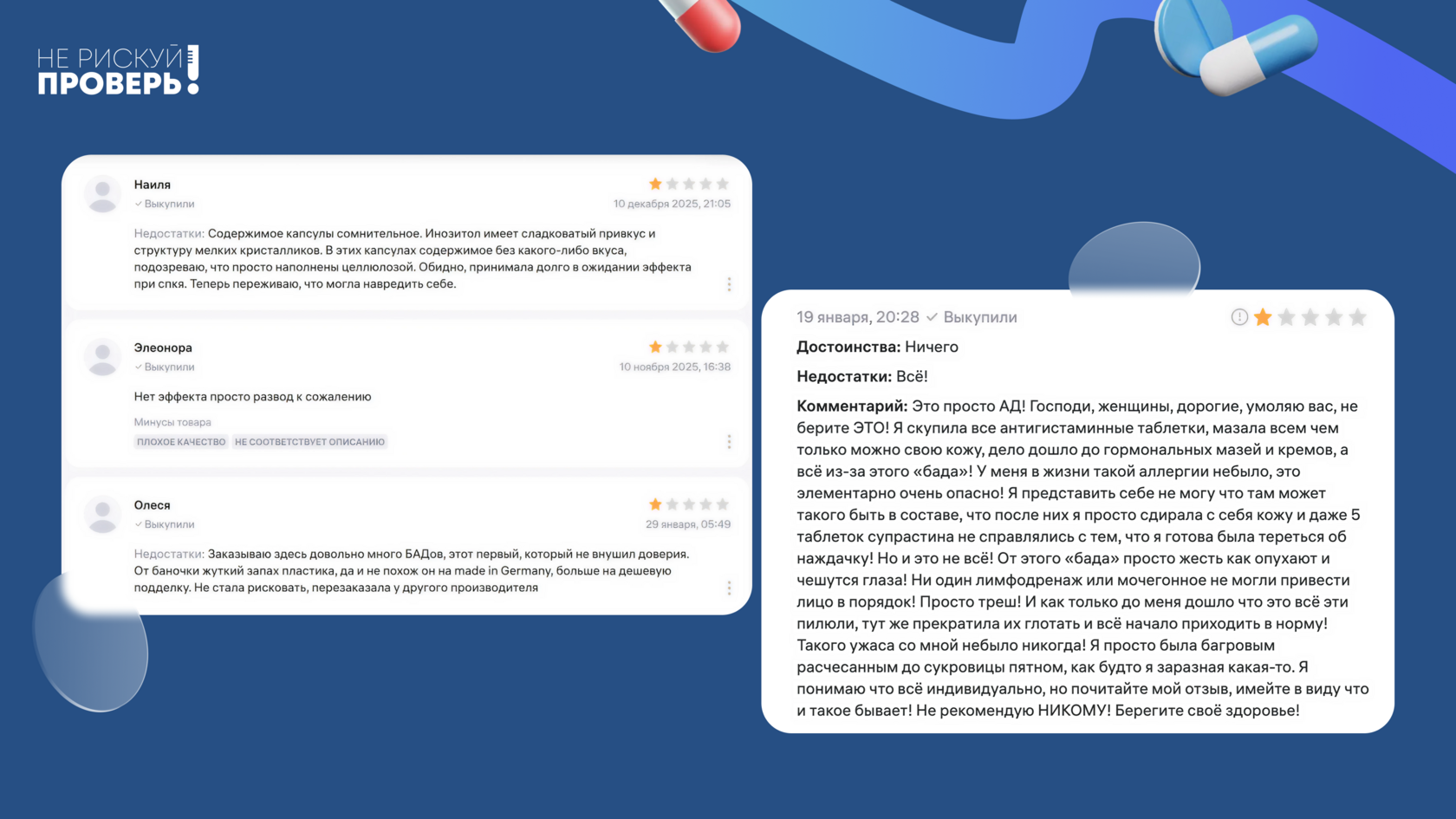 Друзья! Рады сообщить Вам, что в рамках нашего проекта мы запускаем новую рубрику: «Выводим на чистую воду». В ней мы планируем делать обзоры сомнительных добавок, продавцы которых спекулируют на доверии потребителей, выдавая опасный фальсификат за подлинную и качественную продукцию. Вас ждут расследования, из которых вы узнаете, кто и как продает псевдобады на маркетплейсах, какие схемы используют недобросовестные продавцы и какой вред такие продукты могут нанести здоровью человека.
