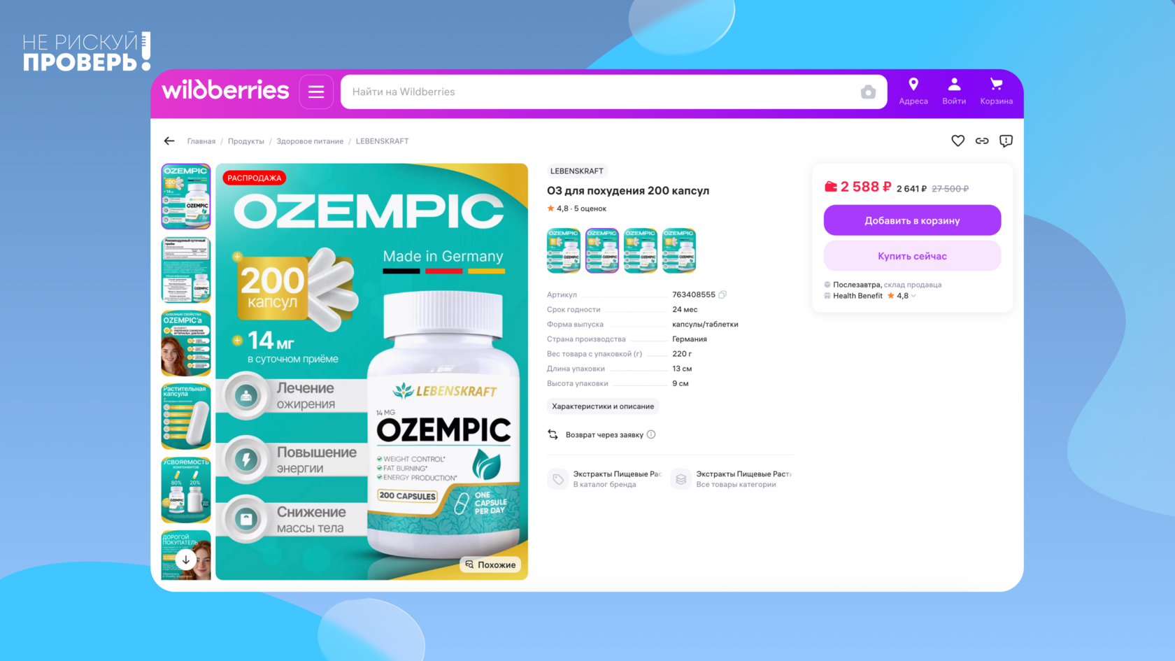 Помимо обычных псевдобадов, магазин Health Benefit торгует и продукцией для похудения с названиями “Ozempic” и “Orlistat”, которые до степени смешения напоминают названия известных оригинальных лекарственных препаратов от диабета. Ранее в описании продавец открыто заявлял в составе этих препаратов лекарственное вещество семаглутид, реализация которого разрешена строго по рецепту. Однако после публикации в «Известиях» семаглутид из описания товара убрали. Сейчас продавец заявляет, что в одной капсуле содержится 120 мг некоего действующего вещества, при этом не уточняя, какого именно. (Про подделки оригинального препарата Ozempic и то, как их распознать, у нас уже есть интересный материал)