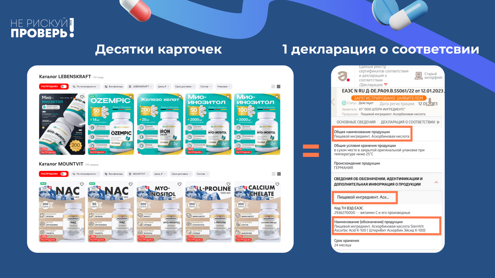 Совокупность выявленных фактов — использование деклараций, оформленных на отдельные ингредиенты, отсутствие сведений о государственной регистрации продукции с признаками БАД, размещение товаров в иных категориях и ограниченный набор документов на отдельные бренды — позволяет говорить о наличии серьезных рисков для здоровья потребителя.
