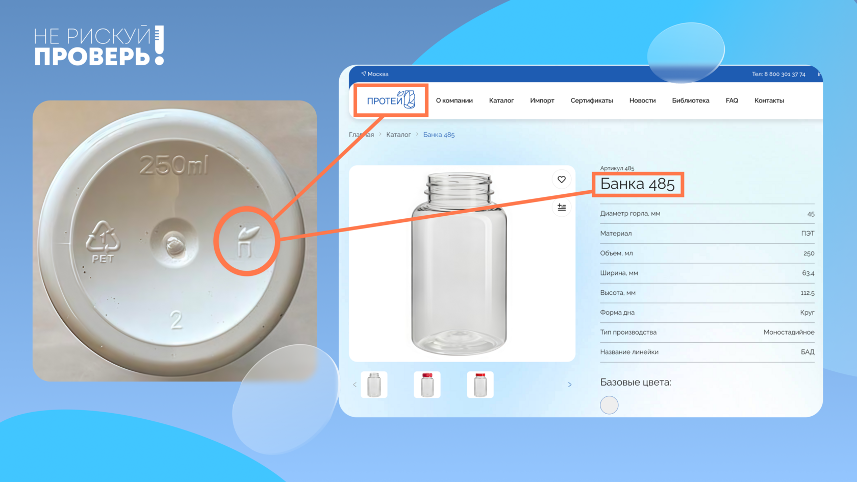 Анализ упаковок показал, что у всех четырех линеек псевдобадов – абсолютно одинаковые банки и крышки, что очень маловероятно, если бы БАДы реально производились в разных странах. При этом на дне пластиковой банки, в которую упакованы капсулы, можно заметить логотип, очень похожий на логотип московского завода «Протей», российского производителя пластиковой упаковки для косметики, бытовой химии и продуктов питания.