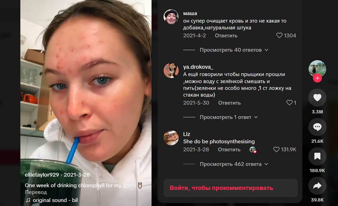Не только ученые отслеживают эффект приема хлорофилла. Один из роликов в TikTok, где девушка с акне начала пить хлорофилл и показала, как со временем менялась ее кожа, собрал 13,9 миллионов просмотров, 3,3 миллиона лайков и почти 22 тысячи комментариев. Подобный интерес говорит об одном - хлорофилл стал настоящей темой для обсуждения по всему миру.