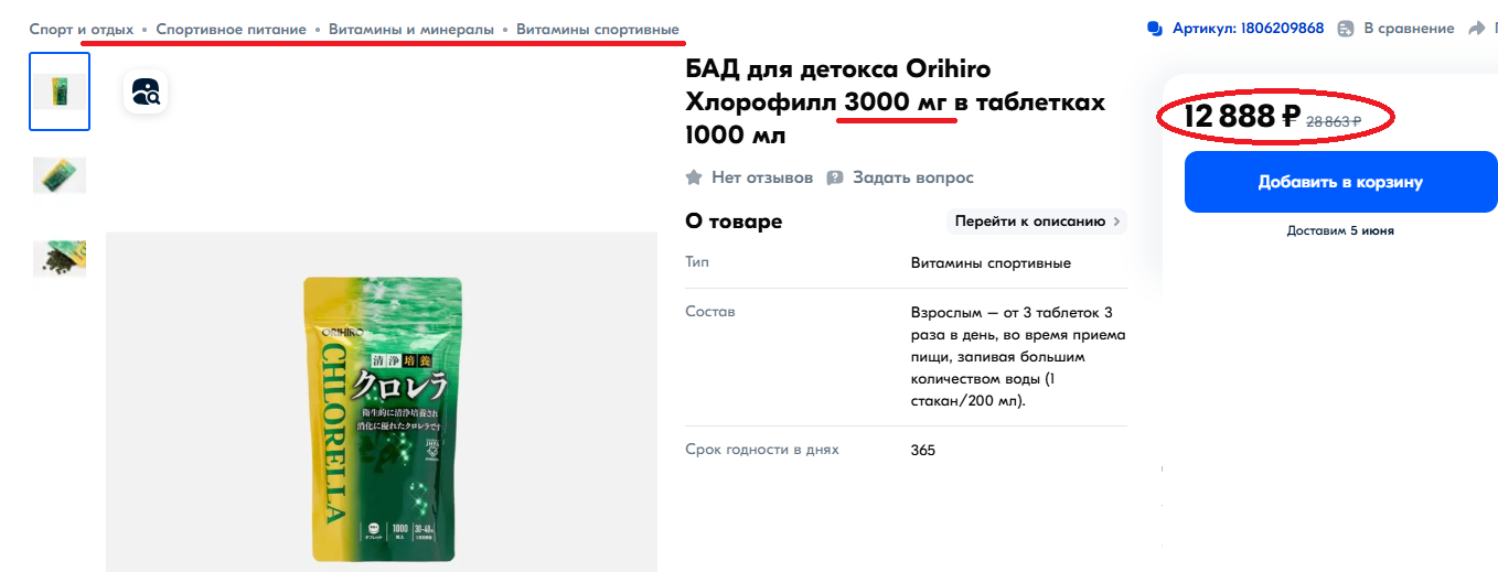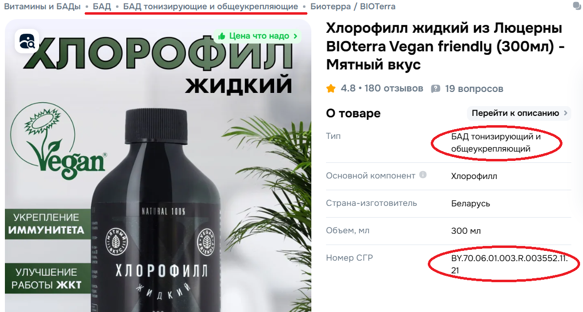 Вообще без каких-либо документов хлорофилл на маркетплейсах чаще всего встречается в разделах “Спорт и отдых” или “Спортивные витамины” (а многие покупатели даже не догадываются, что для спортивного питания также требуется СГР). И все, что нужно продавцу - это как можно красивее описать товар. Ведь карточка на маркетплейсе - это не реклама в прямом смысле, а значит, за обещания вроде “омоложение на клеточном уровне” или “чудо-детокс” никто особенно не спросит. Именно поэтому порой можно встретить откровенно сомнительные заявления, единственной целью которых является привлечение внимания потенциальных покупателей.